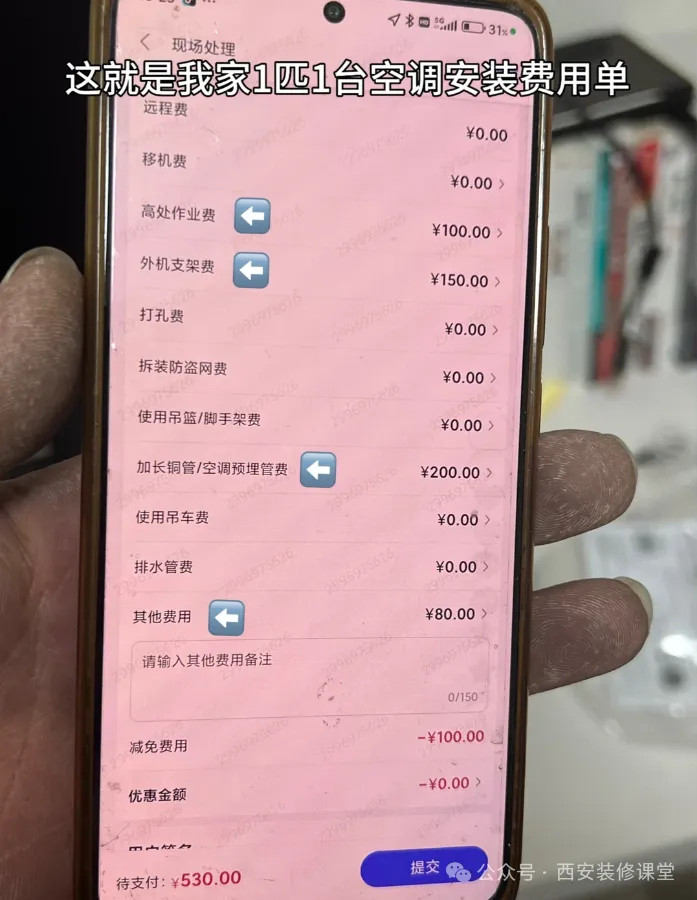 网友@是泡沫:买空调时销售拍胸脯说“免费包安装”,结果师傅上门后,钱包直接被按在地上薅!家里装1台柜机+3台挂机,本以为能省掉安装费,