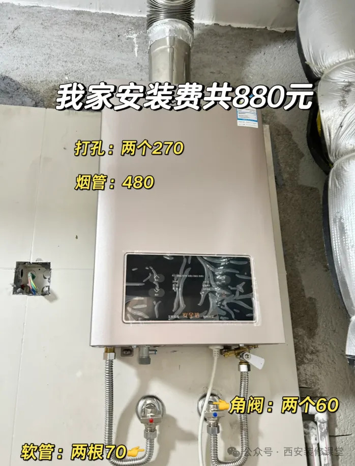 网友@火车:热水器安装共花了880元,如下 打孔两个270元;多加的烟管480元;角阀两个60元;软管两根70元。