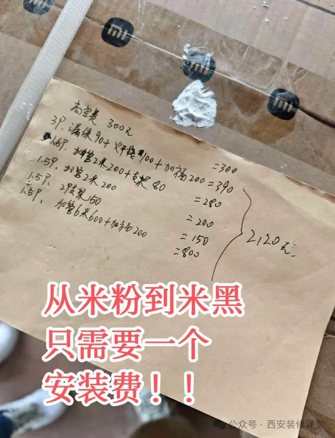 “包安装”,只是基础人工费,包装里面自带的辅材,其他都要收费,包括自备辅材工人师傅也会收另外的安装费用。